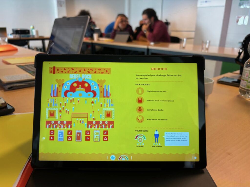 On our first day all partners were introduced to the activities and mission of Het Beroepenhuis as well as to each other. After the introductory phase the development and concept of the Fest It Up! methodology was presented. Our meeting space was then transformed into an experiential workshop, where all partners were immersed in the Fest It Up! workshop and serious game. During the workshop, they learned more about circularity, R-strategies in the form of fan bases and organizing their own festival. At the end of the workshop, each group presented their sustainable festival through a pitch. By experiencing the methodology, all partners shared their feedback on the methodology, this gave us the opportunity to look at improvements that can be made to Fest It Up!