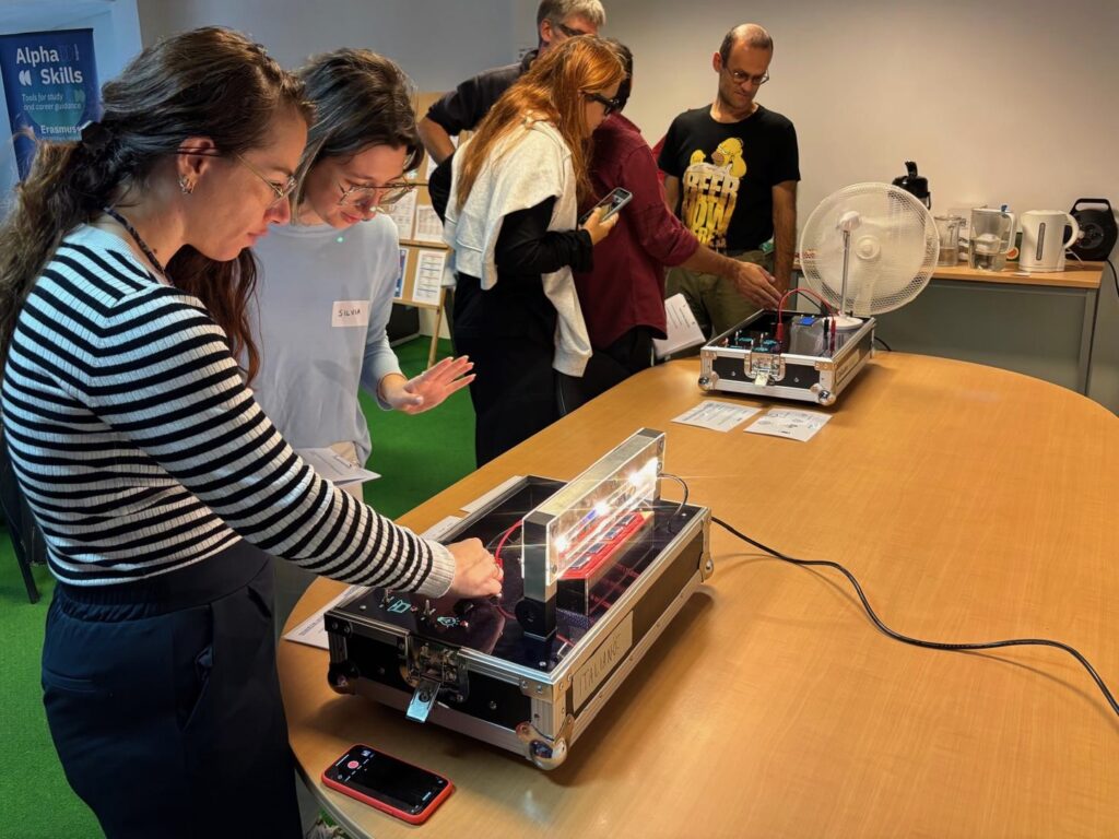 The afternoon kicked off with a visit to a local Flemish partner; our colleagues at the Province of Antwerp. They brought the Technotrailer, a mobile educational trailer designed to spark interest in STEM (Science, Technology, Engineering & Mathematics) among primary school students. It’s a fully equipped truck that transforms into a hands-on learning space filled with interactive experiments and technology demonstrations. The Technotrailer introduced the different experiments and the origin of the Technotrailer, whereafter partners experienced the activities in the Technotrailer. To end the day, we held a round of feedback on the Sun & Wind Energy Lab and shared ideas on how to improve them.